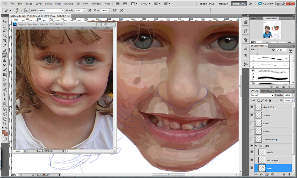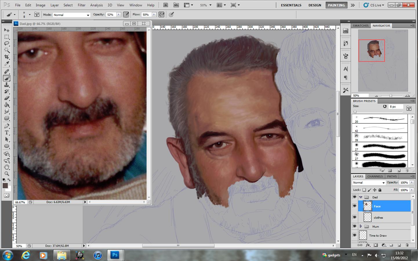 For this stage he loosely sketches several ideas to get a general concept and agreed composition, makes a refined draft line sketch of the best idea and then seek clients approvals before moving on. This saves time and money for everyone and manages expectations. He refines and revises the draft drawings every step of the way as needed until the client is happy.